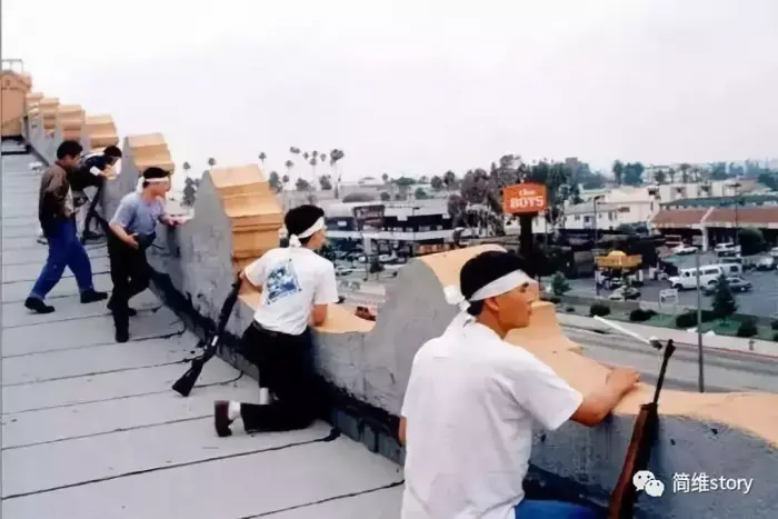 而此前因为1992年3月16日一名非裔小女孩在韩裔的店里偷东西被女老板发现后击倒女老板想逃跑,然后被女老板一枪毙命,然后法院只判罚了韩裔女老板400小时的社区服务,引起非裔的不满,于是很多非裔就趁着此次暴动准备打劫韩国城,警方因为寡不敌众撤走后,早有准备的韩国人却并没有撤出,通过韩语电台的指挥,众多的韩国人拿枪准备保卫韩国城,因为韩国人本身有着服兵役的经历,所以对于枪支还是了解操作的,所以这些韩国人组成了阻击队,用自己手里的狙击枪、手枪等枪反击想要抢劫的暴徒,以自身亡一人的代价,击毙非裔暴徒四人,使得暴徒不敢在抢劫韩国城,转而攻击其他目标,此役过后韩国人的名声大震,以至于很多黑人对韩国人刮目相看,也知道了韩裔的不好惹,当然政府对于韩国城的不作为也受到了批评,有人就说如果被围攻的是非裔城的话,那么政府绝对不会坐视不管,这简直是双重标准。
