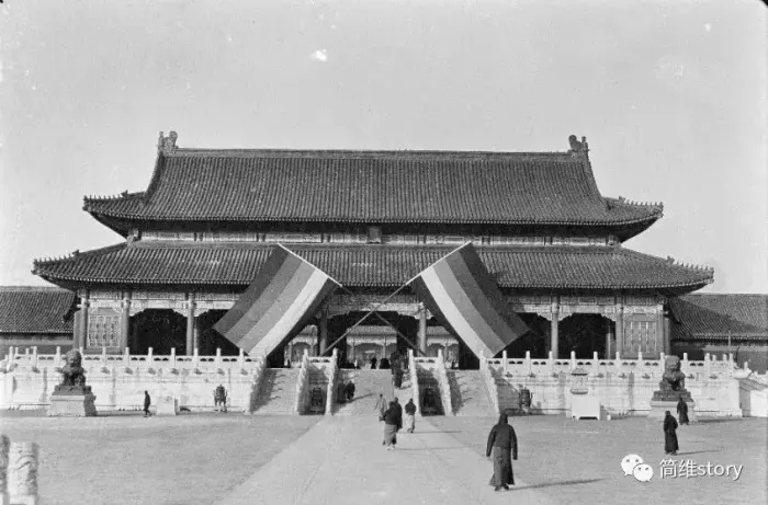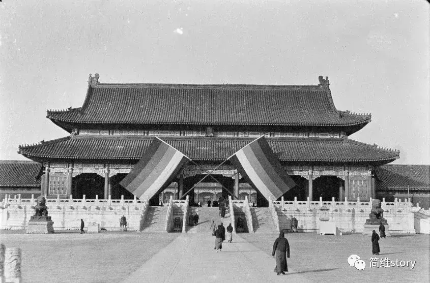 图为北洋政府1918年在故宫庆祝一战胜利的五色旗